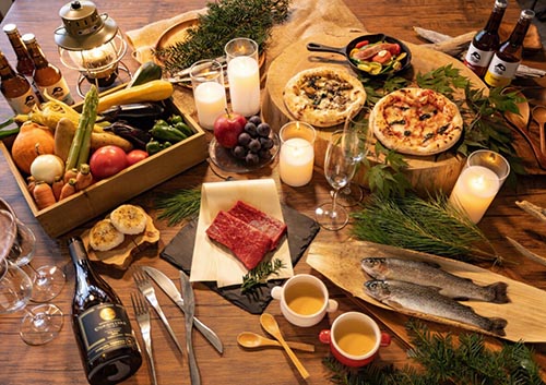 アルプスBASEでは、地元の食材を活用した美味しい食事を提供しています。自然の中で楽しむ食事は格別で、地元の味覚を堪能することができます。
